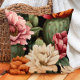 This pillow features a bold cactus floral design with soft cream, peach, coral, and deep red flowers set against rich green cactus pads and a striking black background. The contrast of bright blooms and dark backdrop creates a dramatic and elegant statement piece, perfect for southwestern, bohemian, or modern eclectic décor.