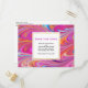 Save the date postcard with a cool trippy psychedelic design. Pink, orange and hints of blue all swirling around. Retro hippie vibe.
