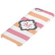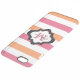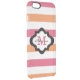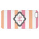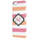 Monogrammed iPhone 6 case with a stylish stripe pattern.The stylish iPhone 6 case has a quatrefoil design label in black and white over the pink ,orange and white striped pattern.