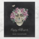 A spooky chic Halloween party design featuring a floral skull illustration topped with pink orchid watercolor flowers on a smoky black background. Personalize with two lines of custom text.