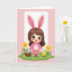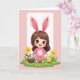 This card shows a sweet, cartoon-style child in a soft pink one-piece outfit with long bunny ears 🐰, smiling wide with big brown eyes that seem to meet yours like a friendly hello. The figure stands on rolling spring-green grass sprinkled with tiny pink-and-white blossoms and two yellow daisy-like flowers 🌷. In one hand, they carry a woven basket filled with brightly colored, patterned oval eggs, held close as if they’re about to share them with someone special. A small fluffy yellow chick stands nearby, angled toward the child as though it’s following along as a close little companion. The colors stay mostly pastel pinks and fresh greens, with gentle shading and rounded edges that make the scene feel soft and inviting. The greeting text sits near the top in a light, cheerful color that contrasts against the pale background, leaving the illustration open and easy to take in. The basket’s handle curves neatly over the child’s arm, and the eggs show stripes, dots, and tiny shapes in several hues. Two bright yellow flowers sit in the grass near the child’s feet, with scattered blossoms around them.