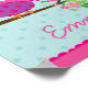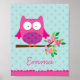 Personalized poster featuring a little pink cartoon owl sitting on a branch with green leaves and hot pink flowers and aqua dots. Fun design for girls. Customizable name.