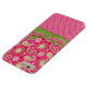 Protect your iPhone 6 Plus in this pretty bright pink and green case. A colorful paisley pattern covers the top half of the case, with a pink and white lattice pattern, on the bottom half. Graphics of a green ribbon, runs across the middle of the case. Customize this pretty case with your own text.