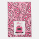 A kitchen towel featuring a pink paisley design. Personalize with your name above pink retro stove.