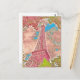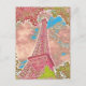 The Eiffel Tower in Paris in shades or pink, rose and coral against a blue sky and branches with leaves, makes a pretty French themed impressionist postcard.