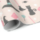 Pink Halloween patterned wrapping paper with pumpkins, witch hats, ghosts, black cats, brooms and more.