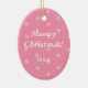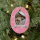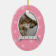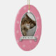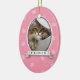 Show how much your pet means to you with this fun ornament. A pet's photo is highlighted in the oval frame with their name printed in the banner underneath. The background is a funky mix of circles and paw prints against pastel pink. Add any message on the reverse. Available in alternate colors with matching products.