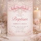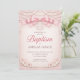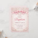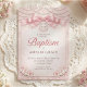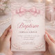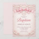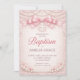This design showcases a soft pink baptism layout framed with elegant pearl garlands, lace textures, and a large satin bow at the top for a graceful and feminine look. A white cross centerpiece adds a meaningful religious touch, while the delicate typography keeps the overall style classic and refined. The blush pink palette and ornamental details create a sweet vintage-inspired aesthetic that feels ideal for christening and baptism celebrations. It will appeal to shoppers drawn to romantic religious artwork with pearls, ribbons, and soft floral accents.