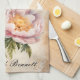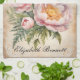Big, lush, pink and white peonies in a bouquet with green ferns, against a worn parchment background with white lace in the corners, against a beige-brown background creates a beautiful and romantic kitchen towel. Personalize with your name at the bottom.