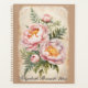 Big, lush, pink and white peonies in a bouquet with green ferns, against a worn parchment background with white lace in the corners, against a beige-brown background creates a beautiful and romantic planner.