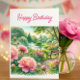 This exquisite pink peony greeting card features a charming watercolor illustration of a park setting with a bench and a serene water feature. The front of the card carries a heartfelt "Happy Birthday" greeting, while the interior offers space for a personalized message, making it a truly thoughtful and memorable card for any special occasion.