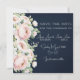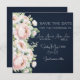 A gorgeous bouquet of pink Peonies against a navy background creates an outstanding contrast on this wedding Save the Date.