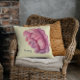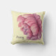 Pretty floral throw pillow features large pink watercolor pink peony bloom on pale yellow / cream background with gray modern script text