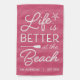 Welcome visitors and guests to your coastal abode with this cute and cheerful beach house garden flag featuring the phrase "life is better at the beach" in white lettering on a vibrant summer pink background accented with starfish and oar illustrations. Personalize with your family name and/or year established beneath.