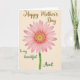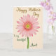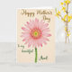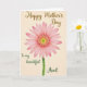 This design shows a large daisy-like flower filling the center, with many soft pink petals fanning outward like a gentle embrace ❤️. Each petal has faint veining and a slightly see-through look, adding a tender, intimate softness to the scene. The round center forms a tight mosaic of tiny florets that shift from light green in the middle to warm yellow and then deeper orange, like a warm glow shared between close friends. A slim green stem drops straight down from the bloom, giving the composition a calm, grounded line against the creamy beige background. Near the top, a short greeting appears in earthy brown lettering, placed above the flower so it feels like a quiet hello. Near the bottom, a longer dedication sits below in leafy green text, balancing the stem and echoing the botanical tones 🌼. The background stays smooth and light, making the pink petals and the yellow-orange center stand out clearly.