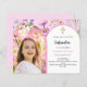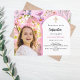 Add your own vertical size photo. A pink arch shaped photo frame. A white background color. Decorated with pink flowers and a golden cross. Personalize and add a name and details.