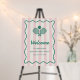 Throw a birthday party by the pickleball court with this preppy pickleball bachelorette party welcome sign. It features a light pink striped background, a curvy, wavy green frame, and an illustration of two pickleball paddles.