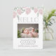This simple and elegant "hello" photo birth announcement features a white background with pink pine cones. The reverse side features a light beige wood background. Personalize it for your needs. You can find matching products at my store.