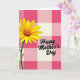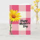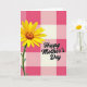 This card features a large yellow daisy-like flower on the left, its long petals reaching outward around a textured orange-brown center, like a gentle hug ❤️. A slim green stem rises from the bottom with a few small leaves and buds, adding a soft, caring touch to the scene. Behind it, the background is a gingham-style check pattern that feels cozy and close, like a shared picnic blanket between loved ones. The squares alternate between blush pink, deeper pink, and white, creating a sweet contrast that keeps the flower feeling sunny and warm 🌼. On the right side, the words “Happy Mother’s Day” are placed in flowing black lettering, standing out clearly against the pink-and-white pattern. The message sits roughly centered vertically, leaving comfortable space around it so the flower and text feel balanced, like two companions side by side. Light shading brings out the petal edges and the grainy texture of the flower’s center without making the scene look harsh. The checkered background shows neat rows of pink squares with thin white lines crossing evenly behind the flower and the text.