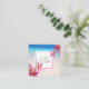 Share the Love Refer a Friend Custom Referral Card design features pink plumeria flowers set on the corners against a beautiful, peaceful white sandy beach background. Gorgeous, unique square referral cards that come in packs of 100.