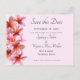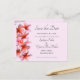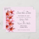 Pink plumeria save-the-date custom postcard in pale pink with realistic flowers. Beautiful Hawaiian flowers, called frangipani or plumeria, make a wide border along the left side. Text is off-center and is easy to personalize line by line. Include mailing address and return address on the back, or delete to order blank.