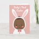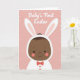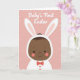 This card features a stylized infant centered on the front, shown with dark skin and a soft, upward-curving smile that feels like it’s meant for someone close. The baby wears a white hooded outfit with long bunny ears 🐰, and the ear interiors are tinted a gentle pink that echoes the background. Coral-toned cheeks add a sweet, affectionate glow, like the child is basking in friendly attention. A small coral-red bow tie sits neatly at the neckline, adding a dressy touch without overpowering the simple shapes. The background is powdery pink with scattered white polka dots, giving the scene a light, celebratory look 🌷. Near the top, white lettering reads “Baby’s First Easter,” placed overhead so it arches above the hood and ears. The illustration uses smooth curves and flat color areas, with the baby’s face and bow tie standing out against the dotted pink field. White polka dots are spaced evenly across the pink backdrop behind the centered figure.
