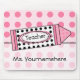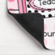 A mousepad featuring a pink background with pink polka dots. Illustration of matching pink crayon at center. Label of crayon is white with black polka dots. Text on crayon reads "Teacher." Personalize with your name.