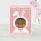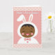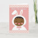Designed with a sweet spring theme, this card features a smiling baby with warm brown skin in a white hooded outfit with long bunny ears lined in pink 🐰. A small pink bow tie and a matching round button sit at the neck, echoing the baby’s rosy cheeks and the open, delighted mouth. The eyes curve upward in a tender, friendly expression that feels like a shared moment of affection. The baby is centered inside a soft pastel-pink rectangular panel that keeps the focus on the face and ears 🐇. Above the panel, the words “Baby’s First Easter” appear in white lettering, placed neatly near the top. A lighter pink border frames the panel, sprinkled with small white polka dots for gentle texture. The overall palette stays in soft pinks and crisp whites, with the ear interiors and accents repeating the same pink tone.