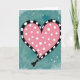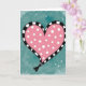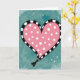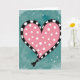 This greeting card features a large heart that fills most of the front, colored bubblegum pink with scattered white polka dots. Around the heart, there’s a black-and-white checker pattern border, finished with a thin black scalloped edge that looks like lace. A curved black line extends from the lower left of the heart like a little whisker, adding a quirky touch. The background is deep teal with a painted texture, sprinkled with small white flecks that echo the dots on the heart. There isn’t any text shown on the card front, so the heart design does all the talking for you. Overall, it feels sweet, a little funny, and perfect for love or close friendship 💘❤️. Share it with someone special to pass along your Valentine’s Day feelings 😘.