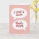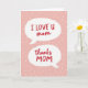 This card features a soft blush-pink background sprinkled with scattered white polka dots, like light confetti drifting across the surface. Centered on the front are two white speech bubbles stacked one above the other, giving the design a friendly, conversational feel. In the top bubble, the text reads “I LOVE U mom” in red, drawn with loose, marker-like lettering that feels like it came straight from the heart ❤️. The lower bubble repeats the same style with “thanks MOM” in red, with “MOM” standing out in all caps for extra emphasis. The bright red words against the white bubbles create a strong contrast that pulls your eyes right to the message. The pairing of the two bubbles feels like a sweet back-and-forth, as if someone is speaking to their mom with an affectionate grin and a grateful pause 🌼. The two speech bubbles sit centrally aligned, surrounded by irregular white dots scattered across the pink background.