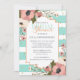 Elegant and modern bridal shower invitation for poppy flowers lovers features accents of poppy flowers and muted shades of pink with lush greenery bursting out, center decor for text area on pale jade stripe background. Personalize with your bridal shower details in soft pastel jade, tan, and old navy typography accented with handwritten style calligraphy and sans-serif. Card reverse to solid pale jade with faux gold metallic polka dots.