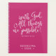 A modern typographical Christian planner featuring the Bible verse Matthew 19:26 With God all things are possible" in white whimsical script font, personalized with your name and year at the bottom. The background color is in bright pink, which can be edited.