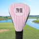 This custom ladies personalized golf driver head cover features white and pink stripes with a customizable monogram on a pink background. It's a stylish, cute gift for a golfer. It's a useful present for your mom, sister, grandma, or any lady whose hobby is playing golf.