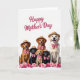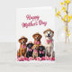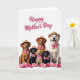 Designed with five friendly dogs posed like a close-knit family portrait on a bright white background, the scene feels sweet and affectionate ❤️. Their coats range from creamy white and warm golden tones to glossy black, and each one wears a straw hat with a pink ribbon plus a matching pink bow tie. The dogs face forward with bright eyes and open-mouthed smiles, giving the group a cozy, togetherness look as if they’re sharing a gentle inside joke. The largest cream-colored dog stands out on the right with a calm, steady posture, while a smaller light-golden pup sits nearer the middle, nestled among the darker companions. Along the bottom edge, a thick band of pink roses spreads across the foreground, softening the scene with layered petals and a garden feel 🌼. Near the top, the words “Happy Mother’s Day” appear in flowing fuchsia lettering, centered above the dogs and easy to read. Soft, even lighting brings out the texture of their fur, the weave of the hats, and the delicate rose petals against the plain white backdrop. The fuchsia text sits above the hat brims, while the rose border runs along the lower edge in clustered pink blooms.