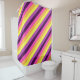 A shower curtain featuring a cute, colorful pattern design of diagonal stripes in plum purple, lavender, lemon yellow, melon orange, and bright magenta.