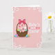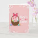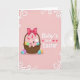 This card features a soft pastel illustration of a brown woven basket centered on a light pink background, with a sweet pink bunny sitting inside and gazing outward with wide eyes and rosy cheeks 🐰. A small white tail peeks from behind, adding a gentle, affectionate note to the bunny’s pose, as if it’s shyly sharing the moment with someone close. Above the basket sits a large fuchsia bow with a satin-like shine that draws your eye upward. Around the bunny, glossy egg shapes in aqua, mint green, golden yellow, and deep lavender tumble and float, with a few resting outside the basket like they’ve just spilled onto the surface. In the corners, thin white swirling flourishes frame the scene like lace, keeping the focus on the bunny and its little celebration 🌷. On the right side, milestone text appears in thick lettering, with small red hearts tucked near the words, and the letters are set in white for strong contrast against the pink. The eggs show bright highlights and soft shadows, and the basket weave is detailed with darker lines that suggest depth and texture.