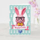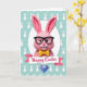 This card features a fluffy pink bunny character 🐰 centered inside a white circular frame, with big gentle eyes and black-framed glasses that give it a friendly, thoughtful look. A small yellow bow tie sits at the neck, adding a cute, dressed-up touch that feels like it’s ready to greet someone special. The bunny’s long ears rise above its head, shaded in deeper pink with soft texture, and the slight tilt of its face suggests a tender, affectionate attention. The background is a calm teal field patterned with small white bunny silhouettes 🐇, creating a cozy setting that feels like shared inside jokes between friends. Near the bottom, a wide ribbon-style banner stretches across the design with the words “Happy Easter” centered in magenta lettering. The text stands out clearly against the banner and echoes the pink tones in the bunny’s ears. At the very bottom, a deep blue faceted jewel shape anchors the layout with sharp geometric angles and glossy highlights.
