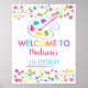 Welcome your party guests with an adorable personalized sign. Frame the sign and display it on a table near the entrance or mount the poster on foam and display it outside on an easel. The design features colorful rainbow paint splatters.