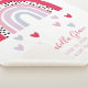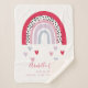 A beautiful, elegant rainbow baby keepsake birth stats sherpa baby blanket. This blanket features a beautiful, modern pink/pastel color rainbow, showering hearts underneath it, and baby's name and birth stats in matching colors and hand lettered script typography. Makes a perfect gift for the new parents of a Rainbow baby, and is bang on trend for nursery decor for any new little one. Copyright Anastasia Surridge for Personalized Home Decor, all rights reserved.
