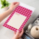 This business mailer features a bold hot pink and red gingham pattern with a cream center panel for the business name and return address. Fun, vibrant, and a great packaging choice for a small business that wants its mailers to stand out.
