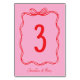 This modern pink wedding table number adds a bright, romantic pop to your reception décor. The hand-drawn bow border and bold red number create a playful yet minimal look that stands out beautifully on tables. Perfect for couples who love colorful, modern details, this table number helps guests find their seats with style. A great choice for pink wedding themes, warm palettes, or whimsical celebrations.