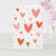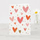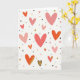 This Valentine’s Day card features a creamy white background filled with hearts scattered across the front in a soft, balanced pattern. The hearts appear in different sizes and shades of pink, coral, and red, creating a warm and cheerful look. Tiny black dots are sprinkled between them, adding contrast and helping guide the eye around the design. Small gold specks are mixed in, along with a few hearts marked by thin gold streaks that catch the light. Near the bottom, one heart stands out with a bold black outline and a rich gold fill, giving the design a clear focal point. With no text or characters, the heart pattern speaks for itself and feels bright, loving, and easy to share with someone special