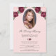 Elegant pink and silver floral memorial service/celebration of life/funeral invitation featuring pink and burgundy red watercolor roses and baby's breath flowers against a pink background. Easily personalize this card with a photo of your loved one and the memorial/celebration of life/funeral details.