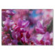 Fine art photography features pink and fuchsia redbud tree flower buds blooming on branches in the spring. Blue sky is dappled in the background, along with a bokeh effect.