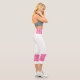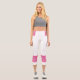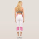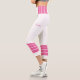 Two-tone design with pink retro style stripes on the lower legs. Horizontal lines in Cyclamen pink on a white background for your sporty Capri leggings. Add a personal touch to your outfit with your name on the left side of these high-waisted athleisure leggings.