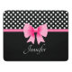 Elegant door sign design with a pink bow and ribbon design on a black and white polka dots pattern. To personalize it, type you name in the template field. Matching home decor available at the Dots & Stripes Pattern Design Studio.