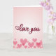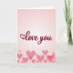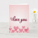 This Valentine's Day card features the words “Love you” in the center in smooth, flowing lettering, colored a deep burgundy. The first letter is replaced by a simple heart outline, so the message starts with a heart shape instead of an “L.” Behind the text, the background fades from a medium blush pink at the top to a very light pink near the bottom. Along the lower part of the card, there’s a scattered row of hearts in different sizes, mostly warm pink, some lighter and see-through. The hearts overlap a bit and feel like they’re drifting upward, adding a sweet, romantic touch 💕. The main words have a faint shadow that helps them stand out without looking heavy. Overall, it’s a soft and loving design that feels perfect for a partner or close friend ❤️.