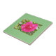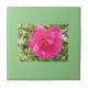 A Ceramic Tile with a Picture of a Pink Rose on it , with a Green Back Ground.