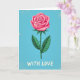 This card shows a large pink rose filling most of the front, with petals that shift from deep fuchsia in the middle to a softer blush at the edges. The rose looks fresh and open, and it sits on a green stem with small thorns and a few wide leaves with visible veins. Behind it is a bright blue background with a lightly worn, speckled texture that makes the scene feel a bit like an older print. Near the bottom, the words “WITH LOVE” appear in white, thick hand-drawn lettering that stands out clearly against the blue. The simple message and the single rose give the card a calm, caring feel that fits romance or close friendship. The strong pink and blue contrast makes the flower pop in a way that feels warm and direct 💕❤️.