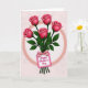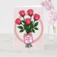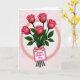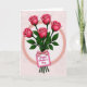 This card shows a bouquet of five roses in deep pink, their petals curling into smooth spirals with a light glossy shine that feels like a quiet romantic gesture ❤️. Dark green stems rise through layered emerald leaves, and the whole arrangement sweeps upward as if being offered to someone special. Soft, diffused lighting highlights the petal edges and leaf veins, giving the flowers a gentle, affectionate presence. Behind them sits a pale pink background with faint, intertwined floral patterns that add a cozy, friendly atmosphere 🌼. Near the stems, a small rectangular message tag is tied on with a red-and-white checkered ribbon, like a little note meant for one person. The tag has a patterned border, and the main text is centered on it in a dark ink tone that stands out clearly against the light tag color. A peach-toned circular frame with scalloped edges curves around the lower part of the bouquet, grounding the design with a soft decorative finish.
